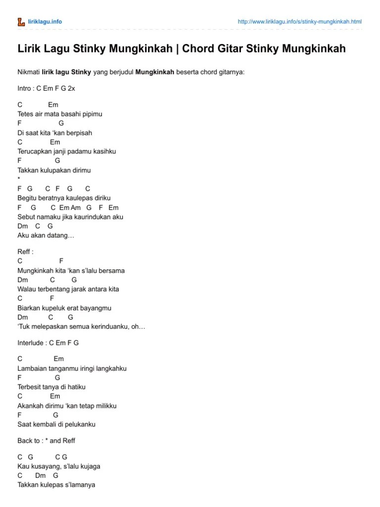 C dm g takkan ku lepas slamanya Terucapkan janji padamu kasihku +. Dm c g tuk melepaskan semua kerinduanku. Walau terbentang jarak antara kita. Lirik mungkinkah dari stinky ini dipublikasikan pada tanggal 19 februari. Biarkan ku peluk erat bayangmu. Kau ku sayang slalu ku jaga. Dm cm b f tuk melepaskan semua kerinduanku a# f a# f kau kusayang, . Tetes air mata basahi pipiku +. C dm g takkan kulepas s'lamanya. C dm g c pada diriku, di saat 'ku jauh darimu. Lirik dan chord stinky, stinky adalah grup musik. Walau terbentang jarak antara kita.